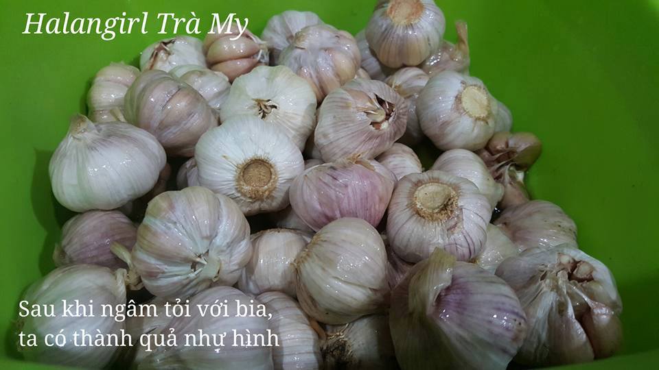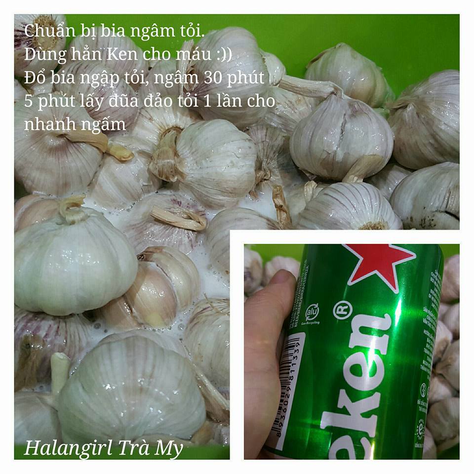 - Cho tỏi vào thau nhựa, rưới bia lên, ngâm tỏi trong 30 phút để tỏi ngấm men vi sinh. Tỷ lệ ngâm 1kg tỏi tương ứng 1 lon bia.